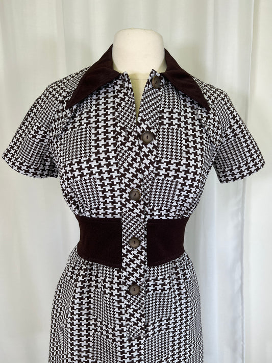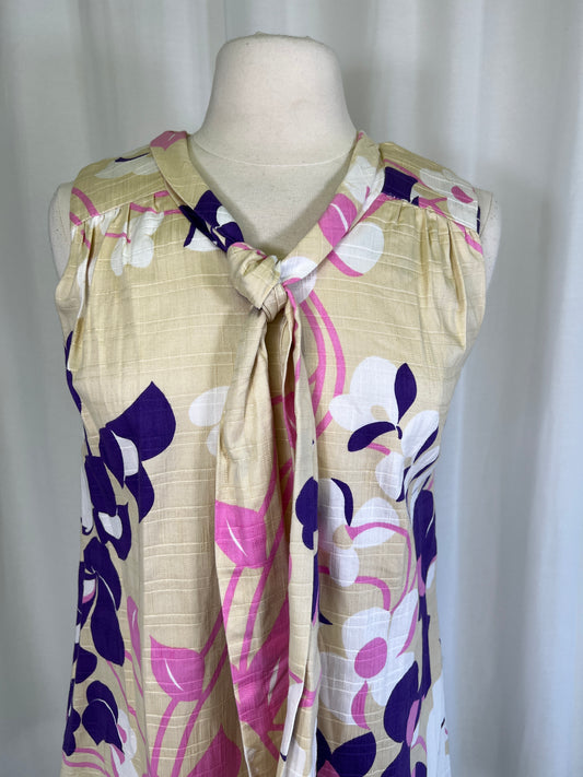 1960's Tan & Purple Floral Tie Neck A-Line Dress