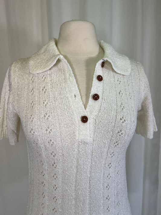 1970s White Pointelle Polo Button Sweater