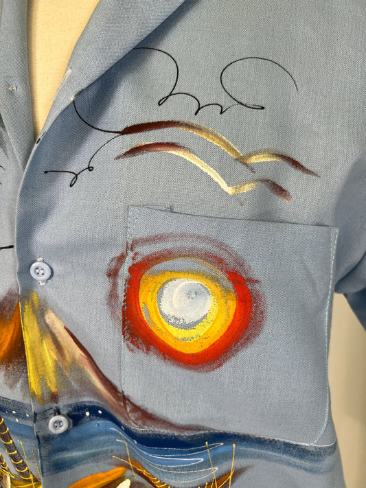 1980s Hand Painted Tahiti Palm Tree Scene Souvenir Button Up