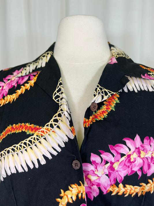 1990's Black Tropical Lei Print Blouse