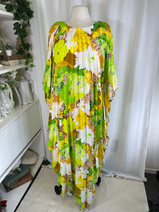 70s Hawaiian Print Pleated Kaftan Maxi