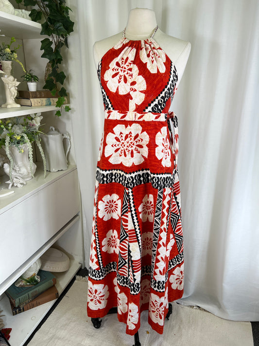 70s Hawaiian Print Halter Neck Red Wrap Dress