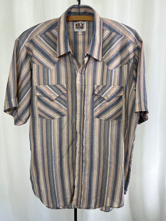 80s Ely Cattleman Brown and Blue Striped Pearl Snap Western Shirt