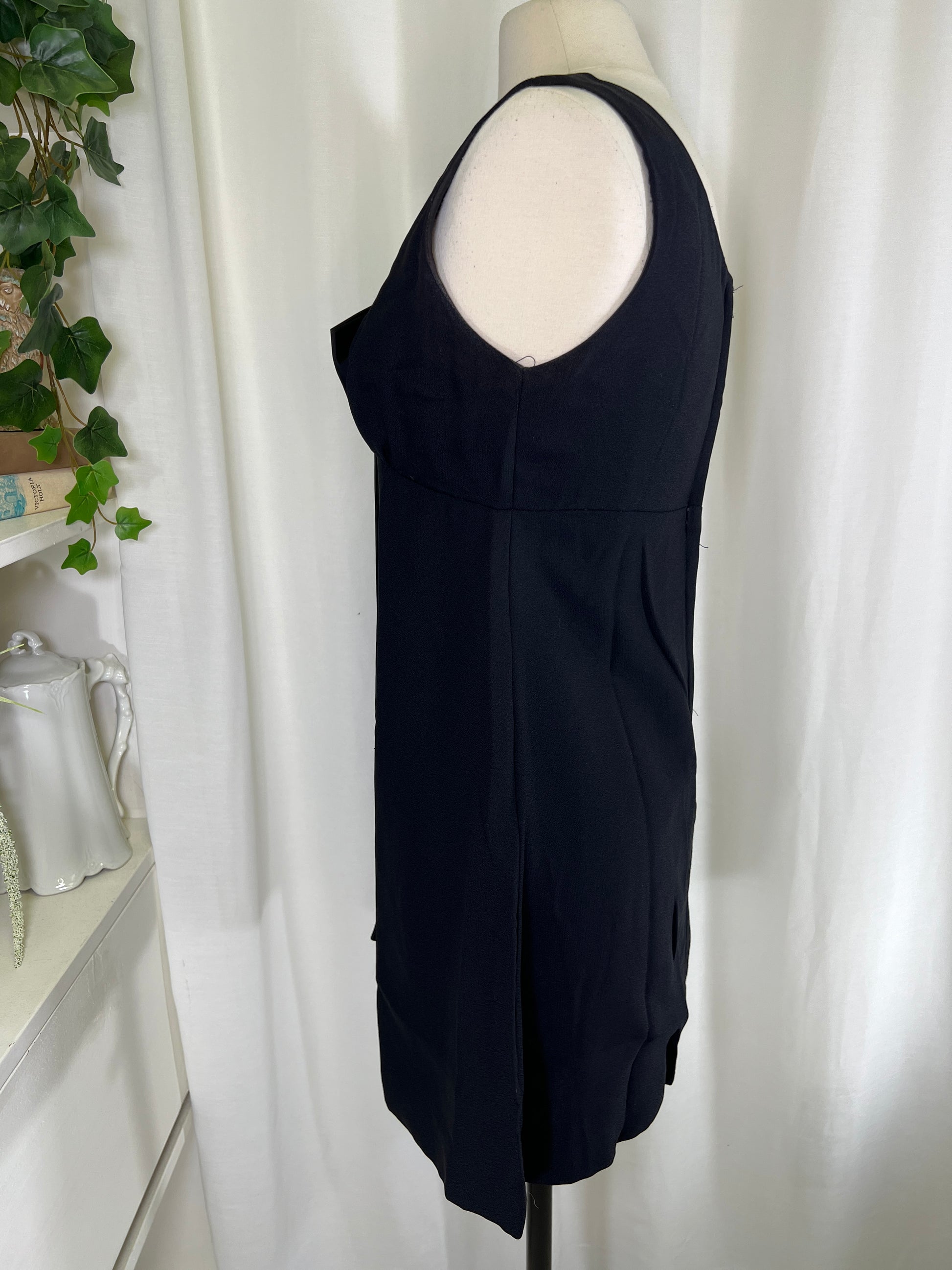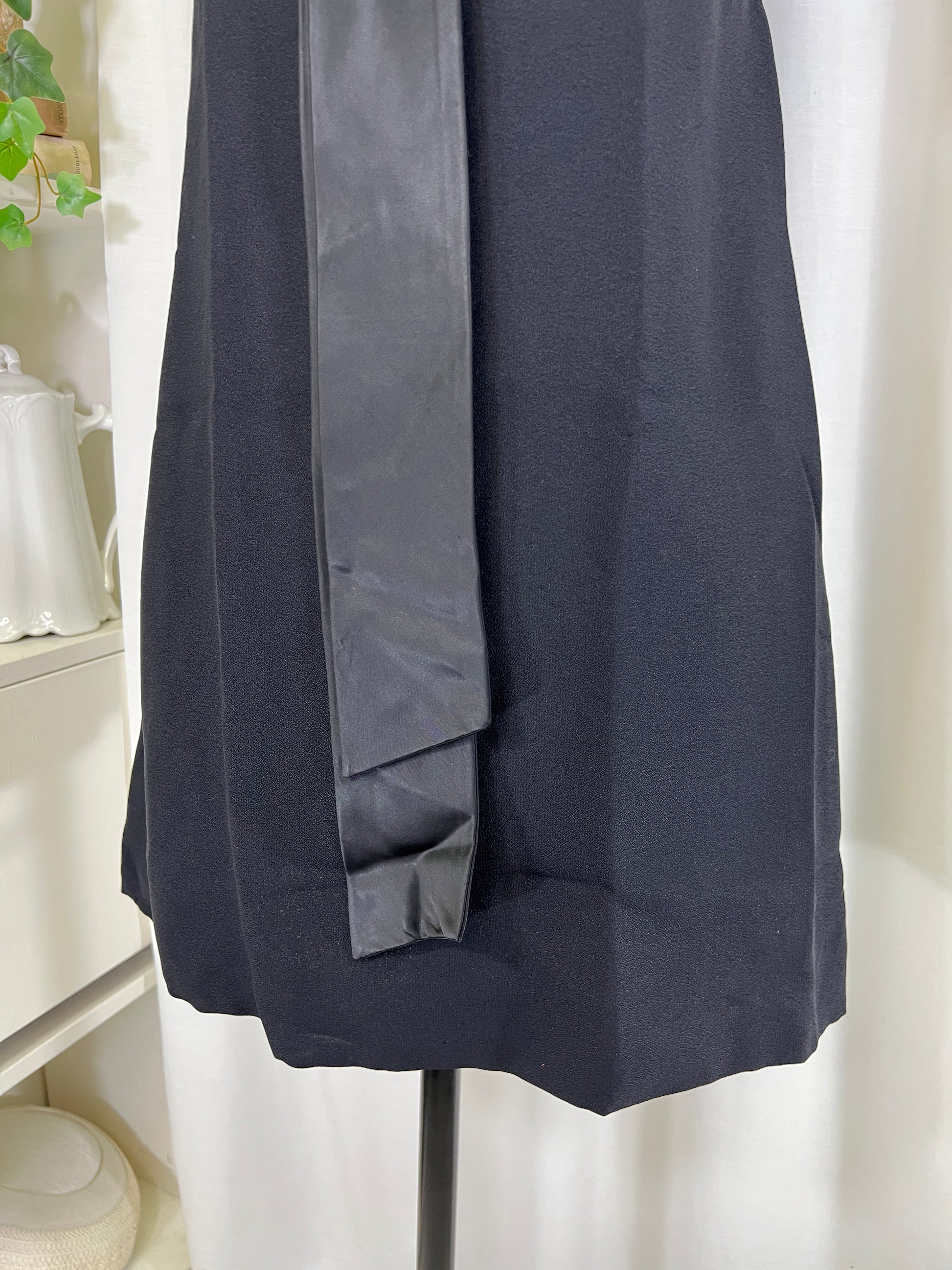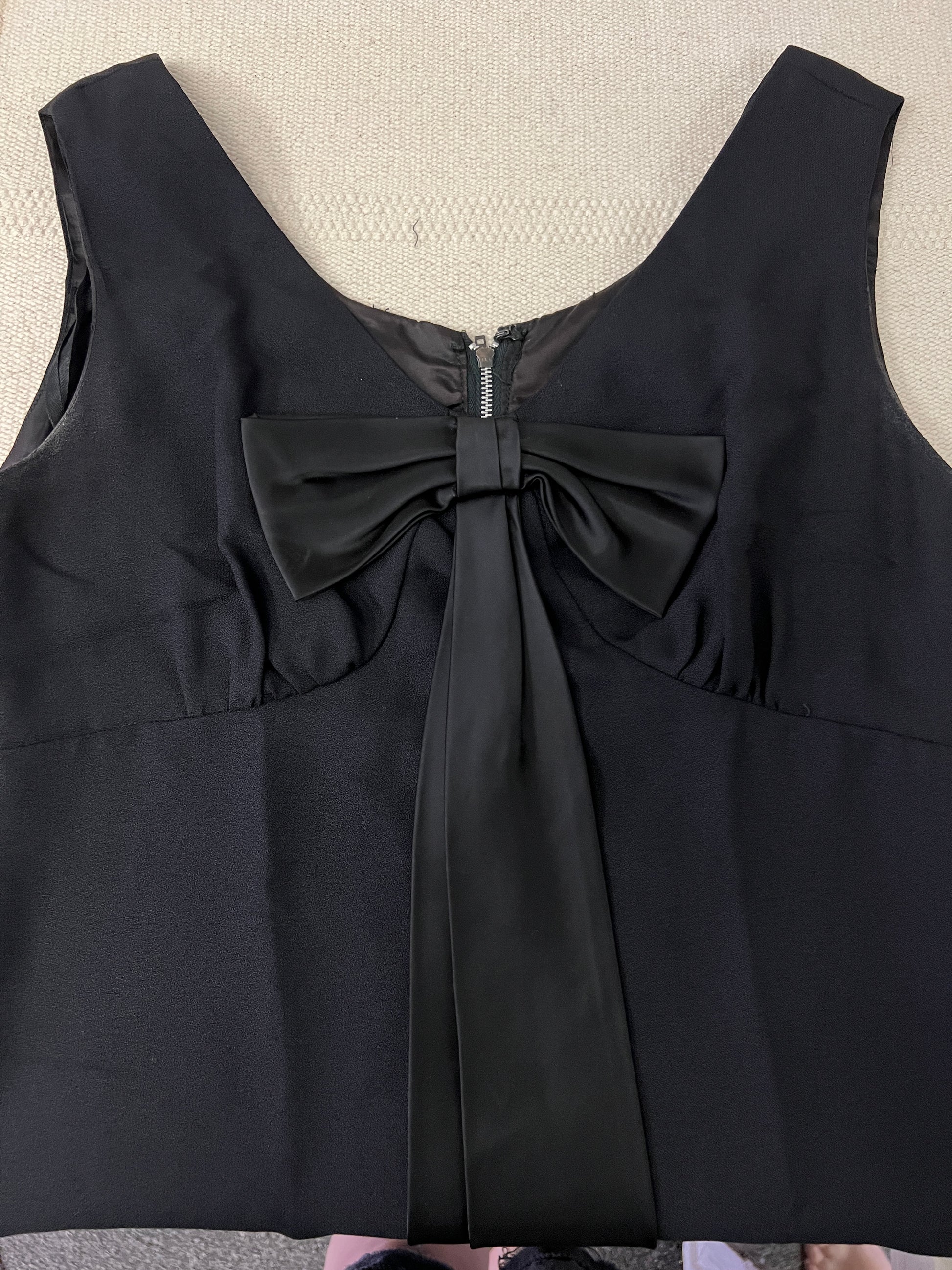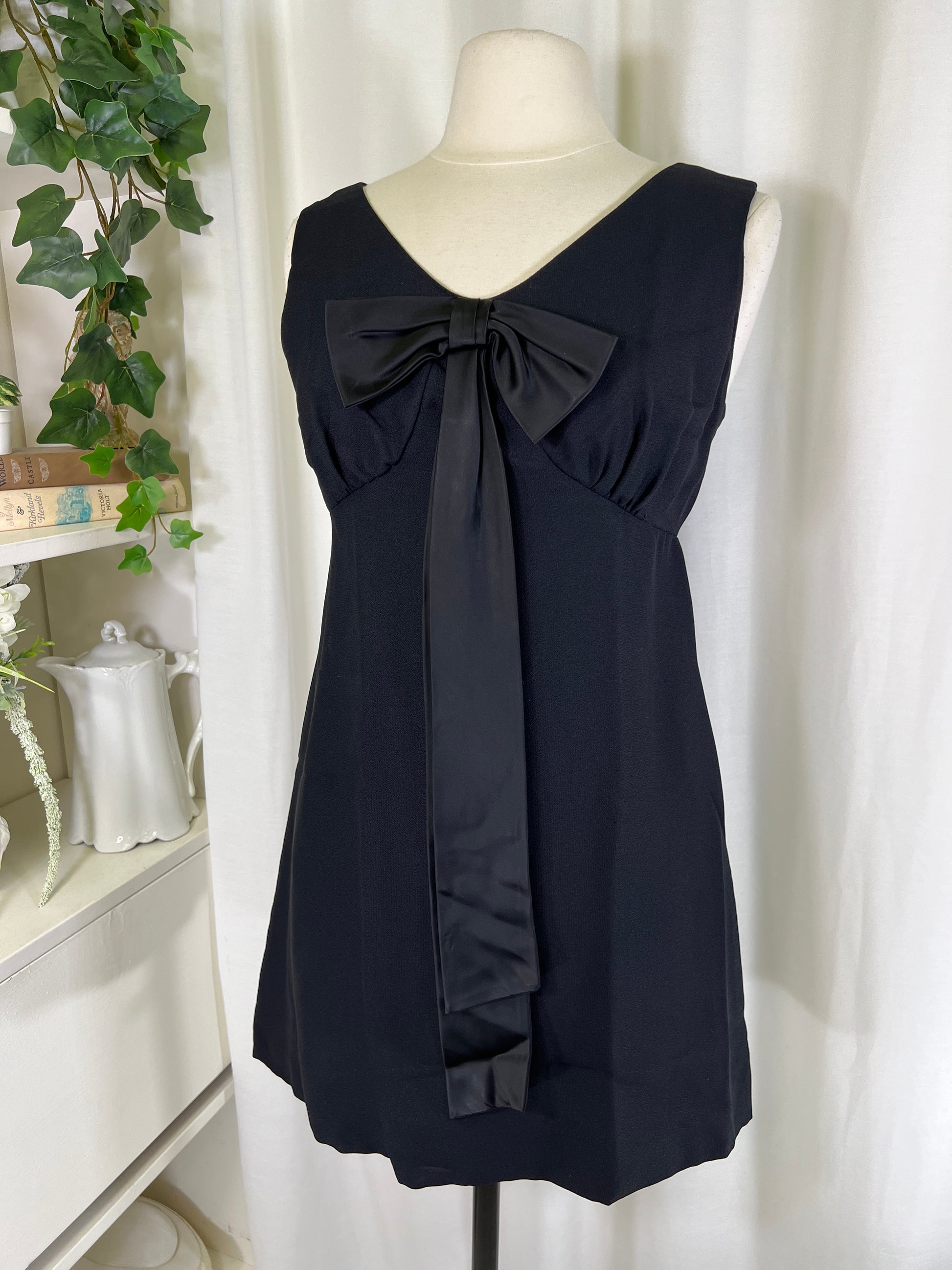 You can have all of the aesthetics of the valley of the dolls without all of the drama with this perfect mini! The bow hangs extra long and it has the most perfect shape to the bust! Would be out of this world paired with fluffy kitten heels!