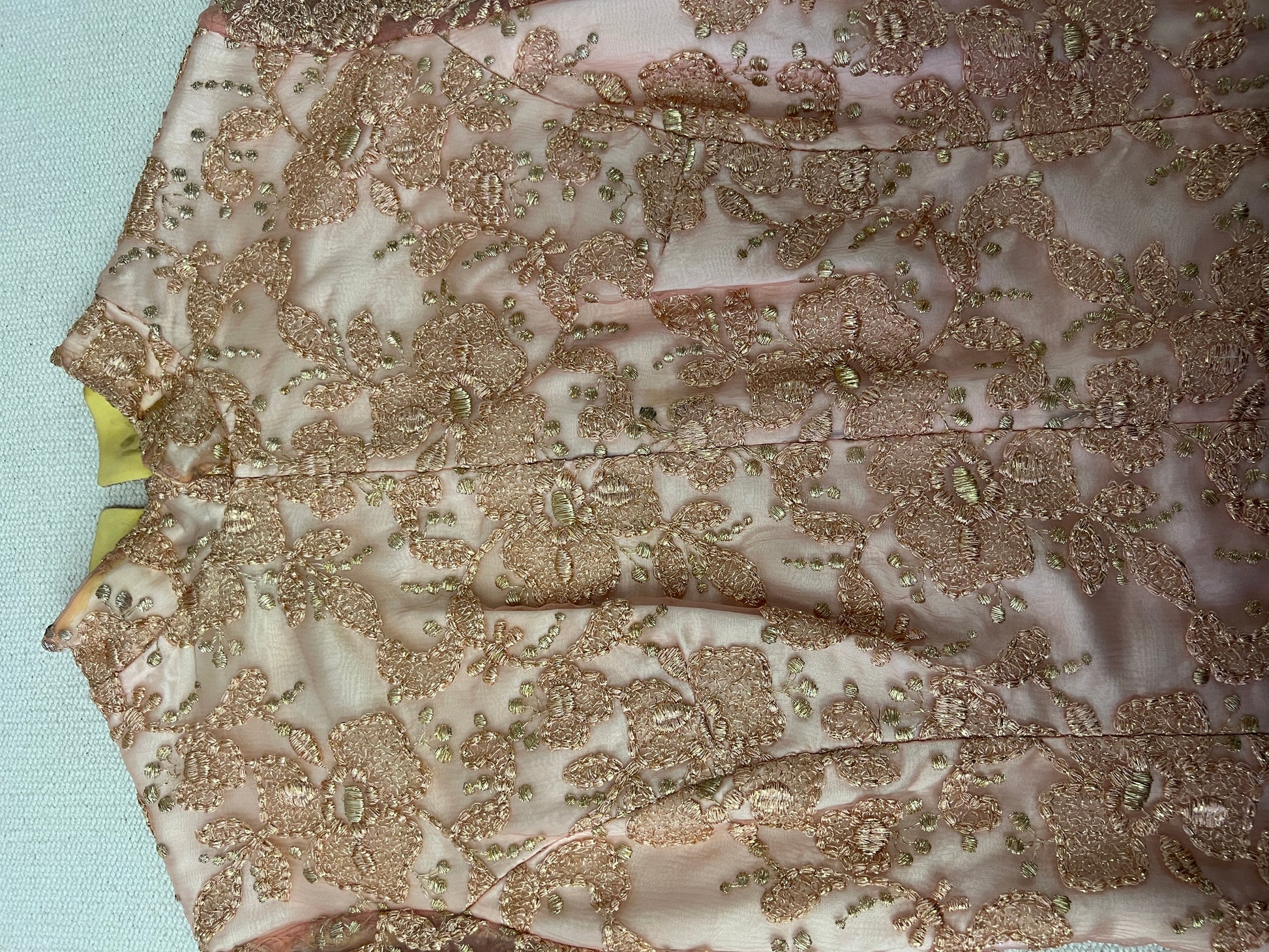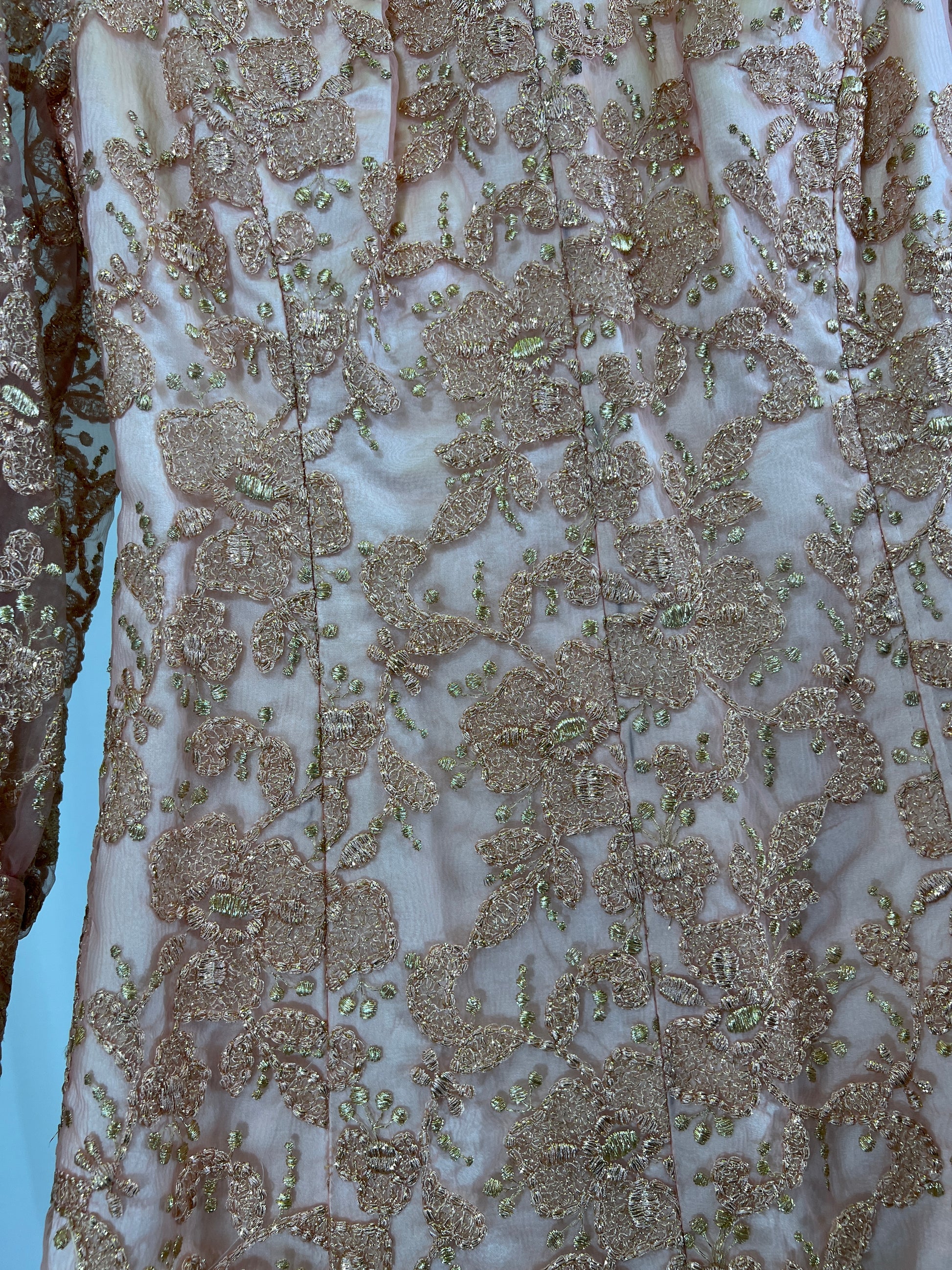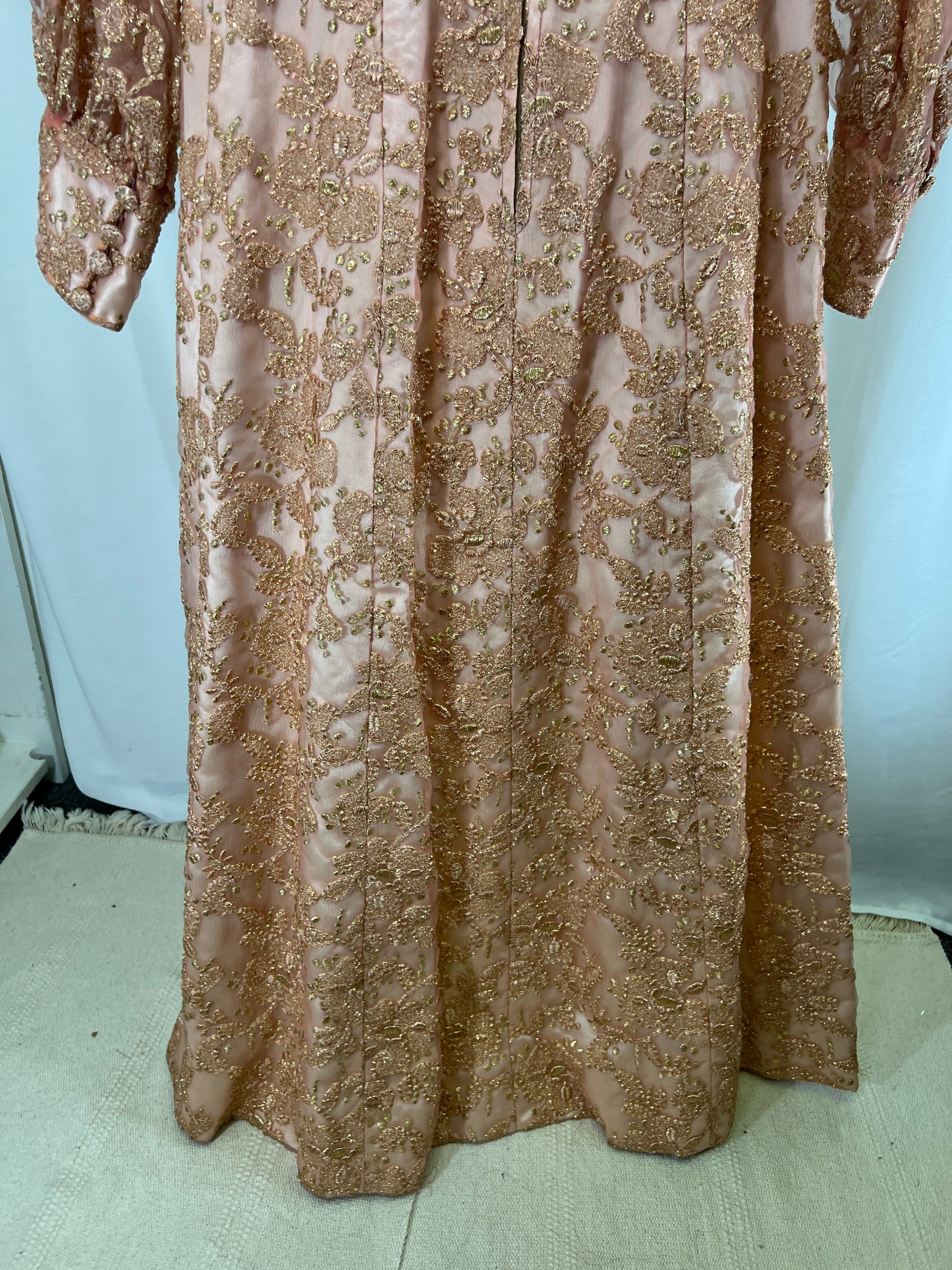 60s Handmade Pink and Gold Lamé Floral Embroidered Maxi Gown