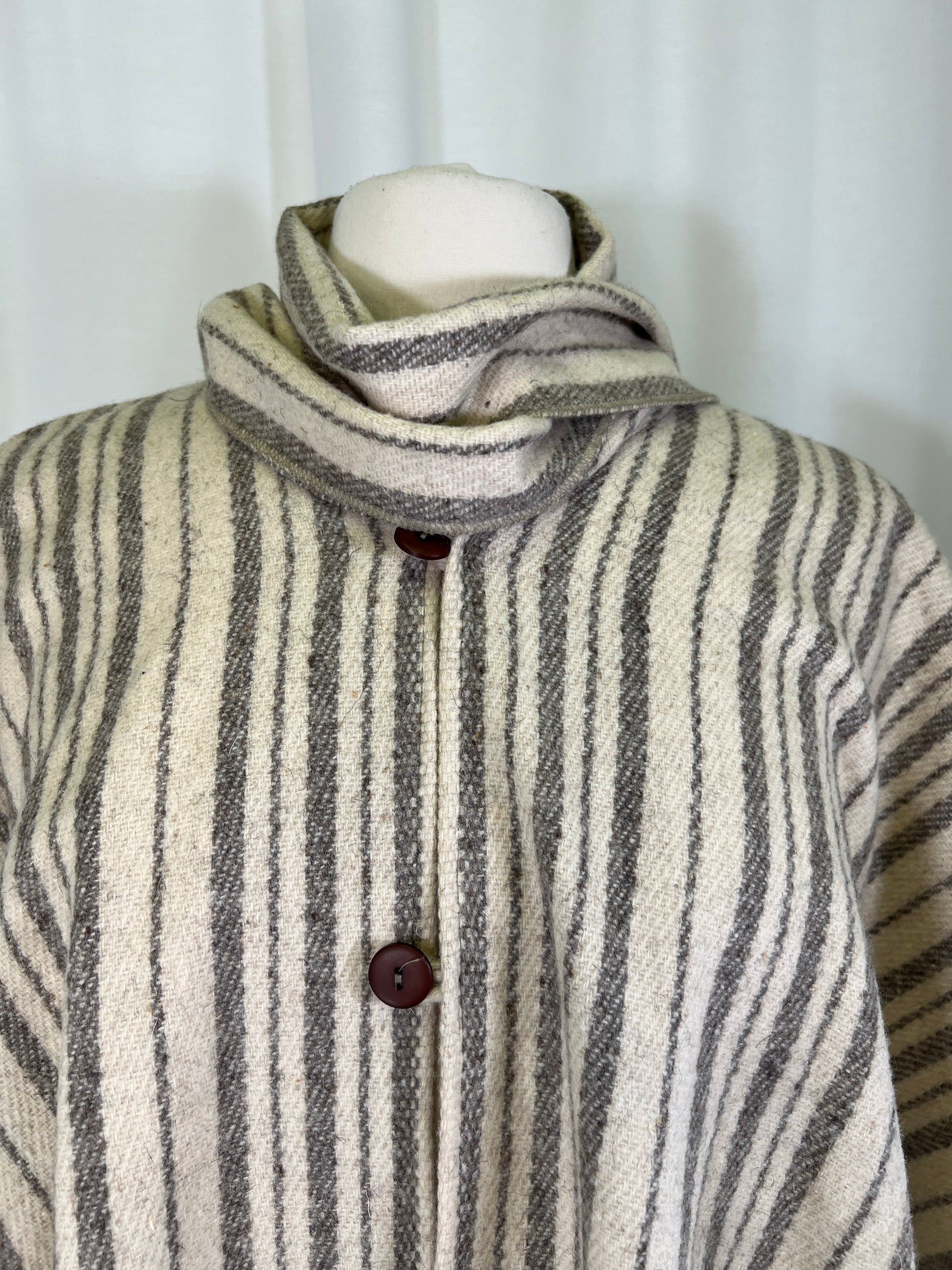 70s Cream and Grey Striped Round Wool Cape Poncho