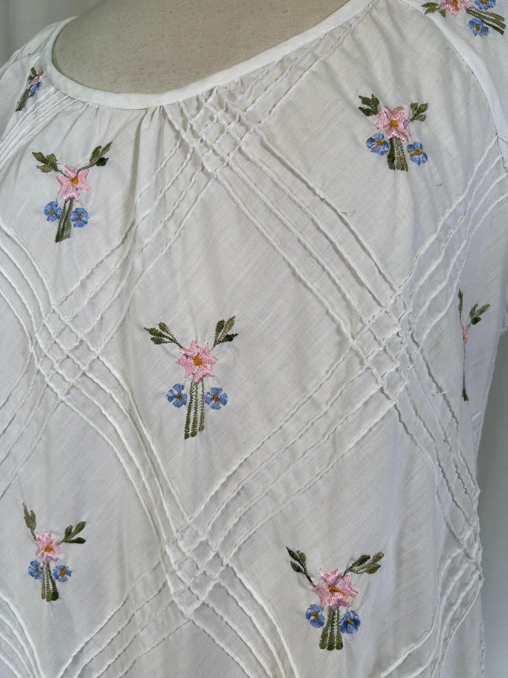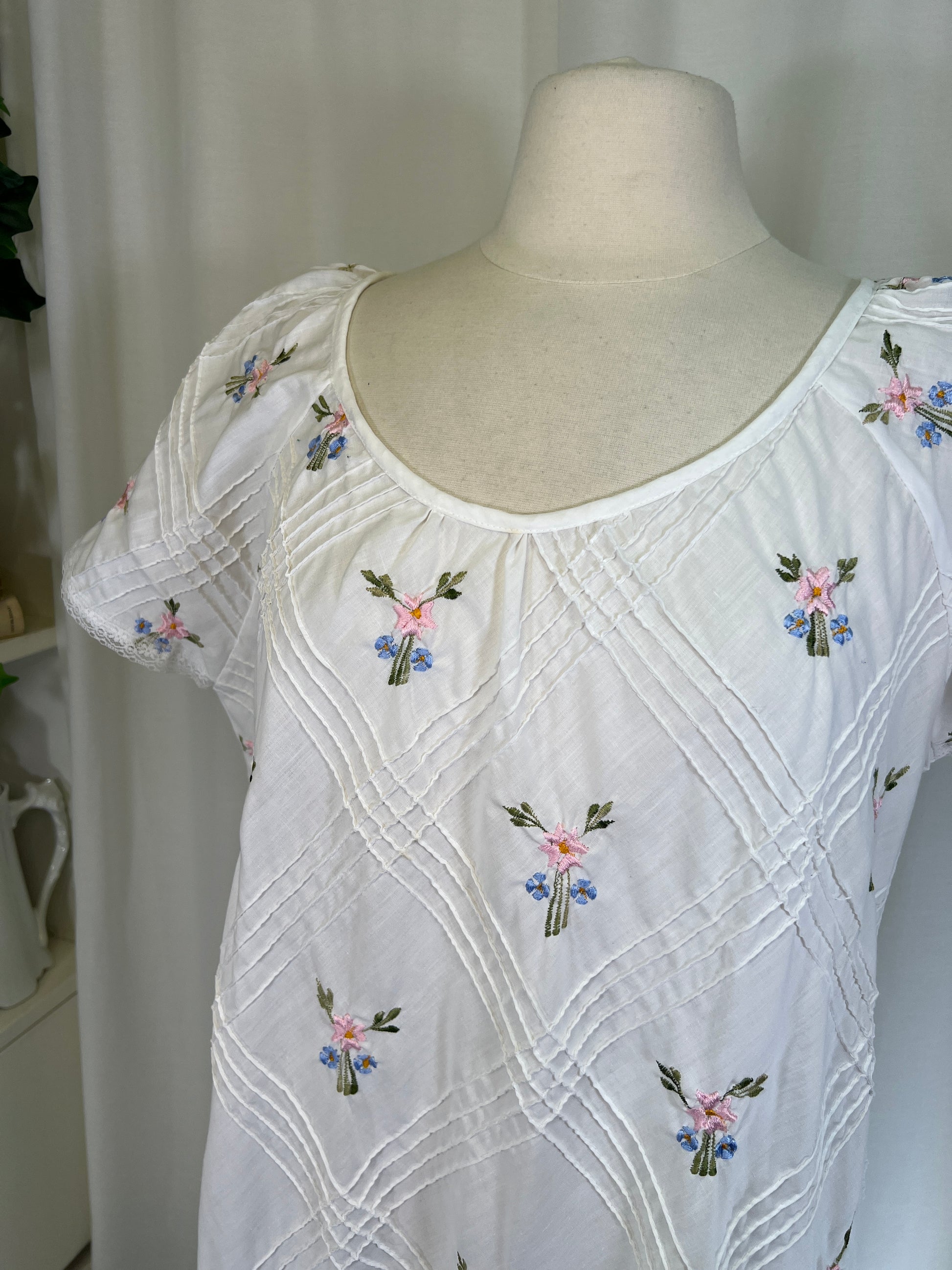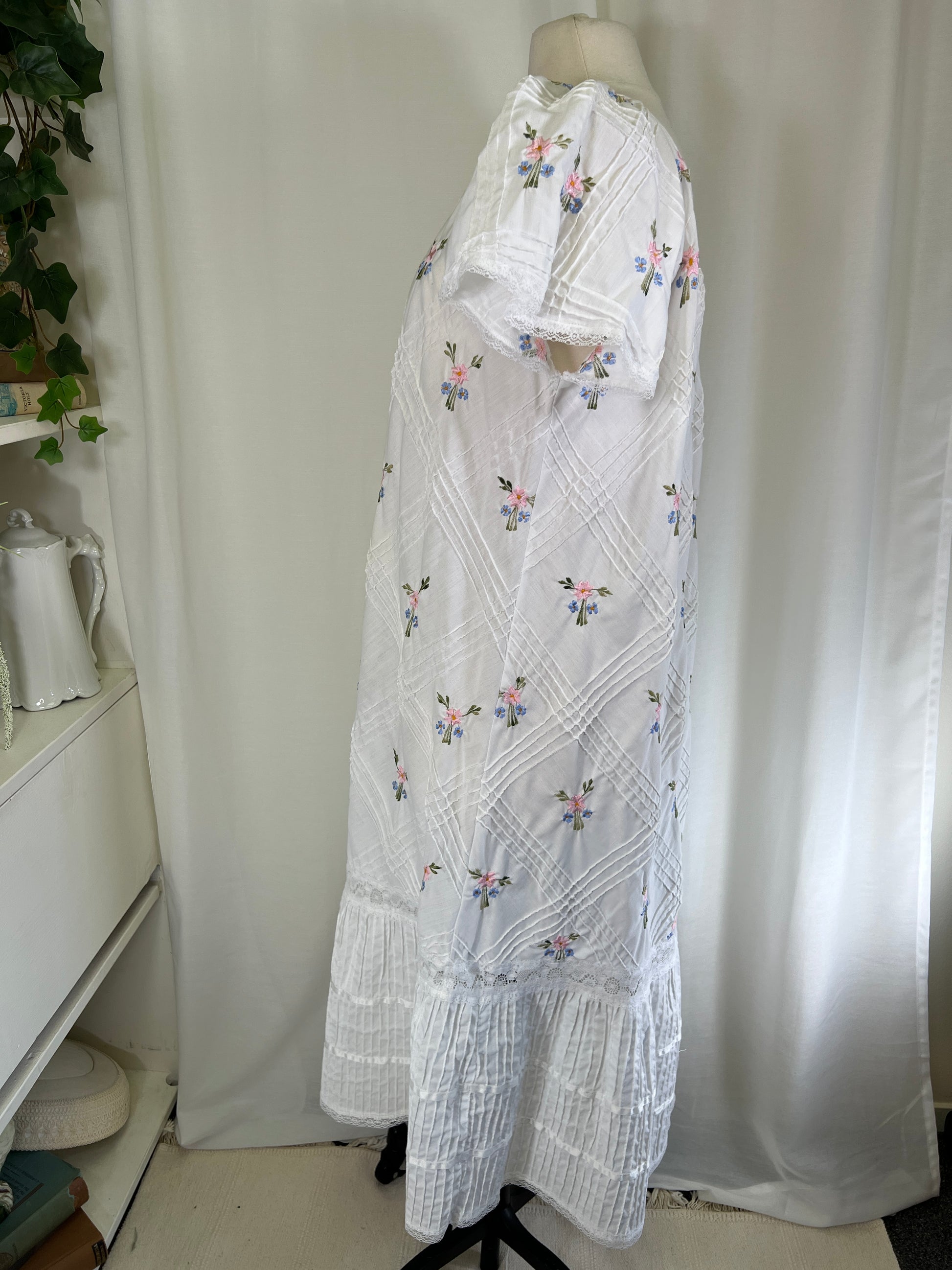 This dress can’t wait to go on a picnic and frolic in a meadow. So perfect with bare feet and a picnic basket for summer fun! Also super cute belted with boots! There is a small hole at the bottom that is pictured, but isn’t noticeable while wearing.