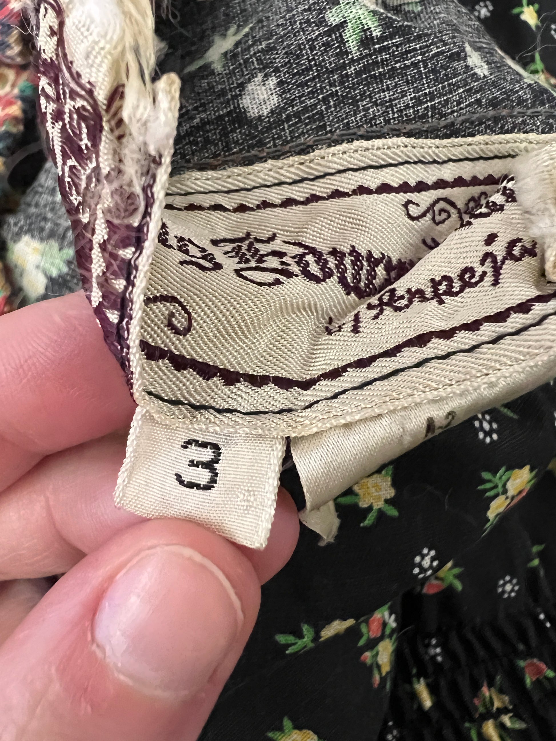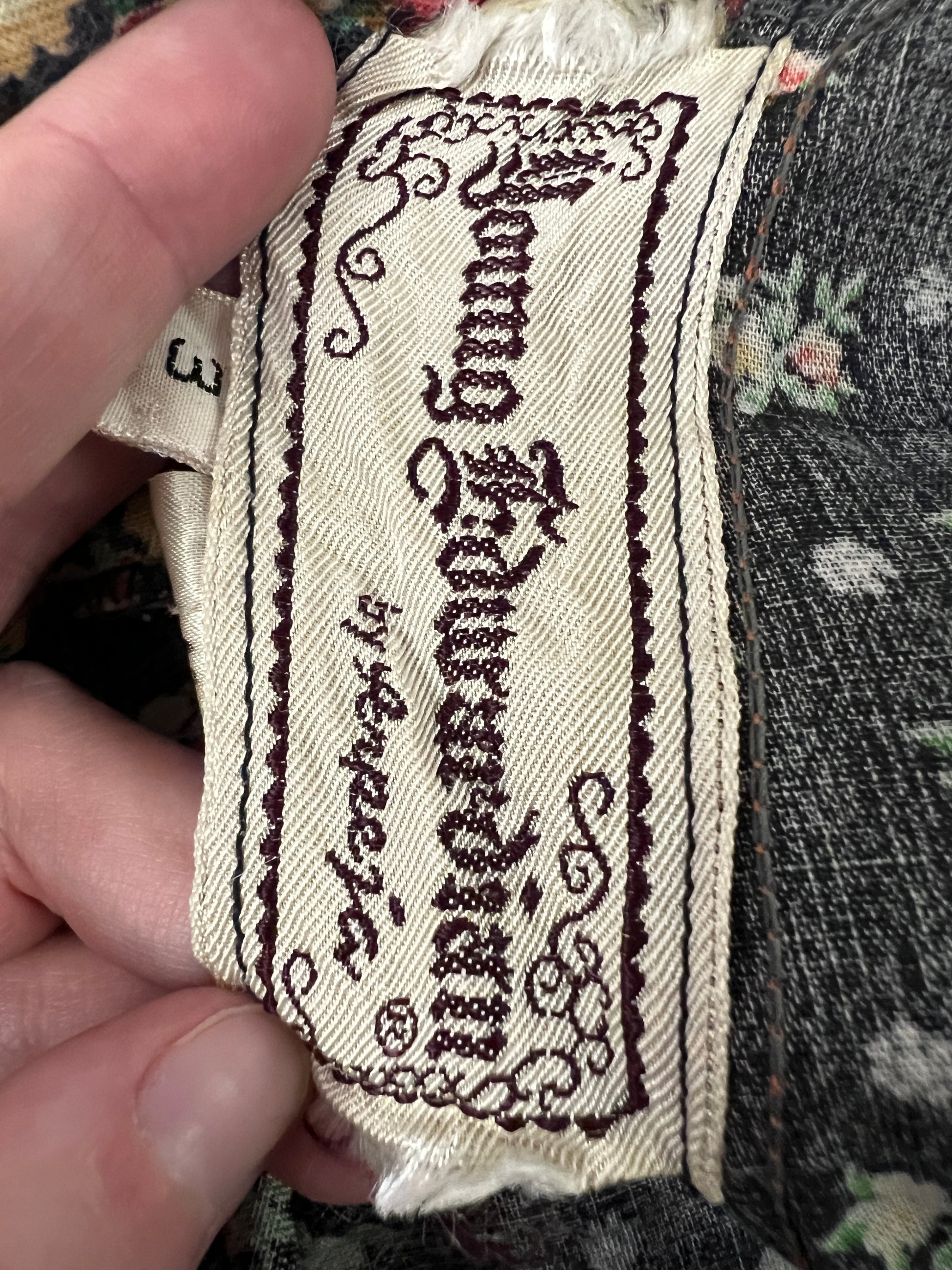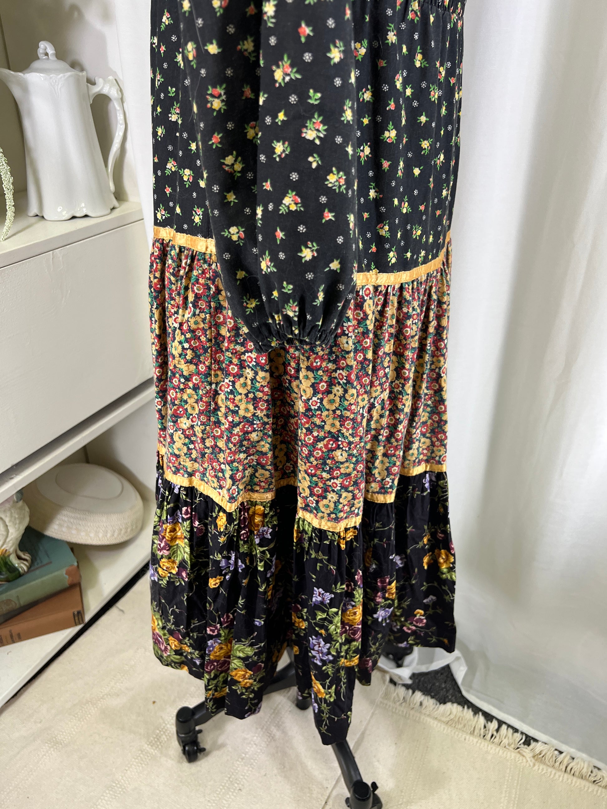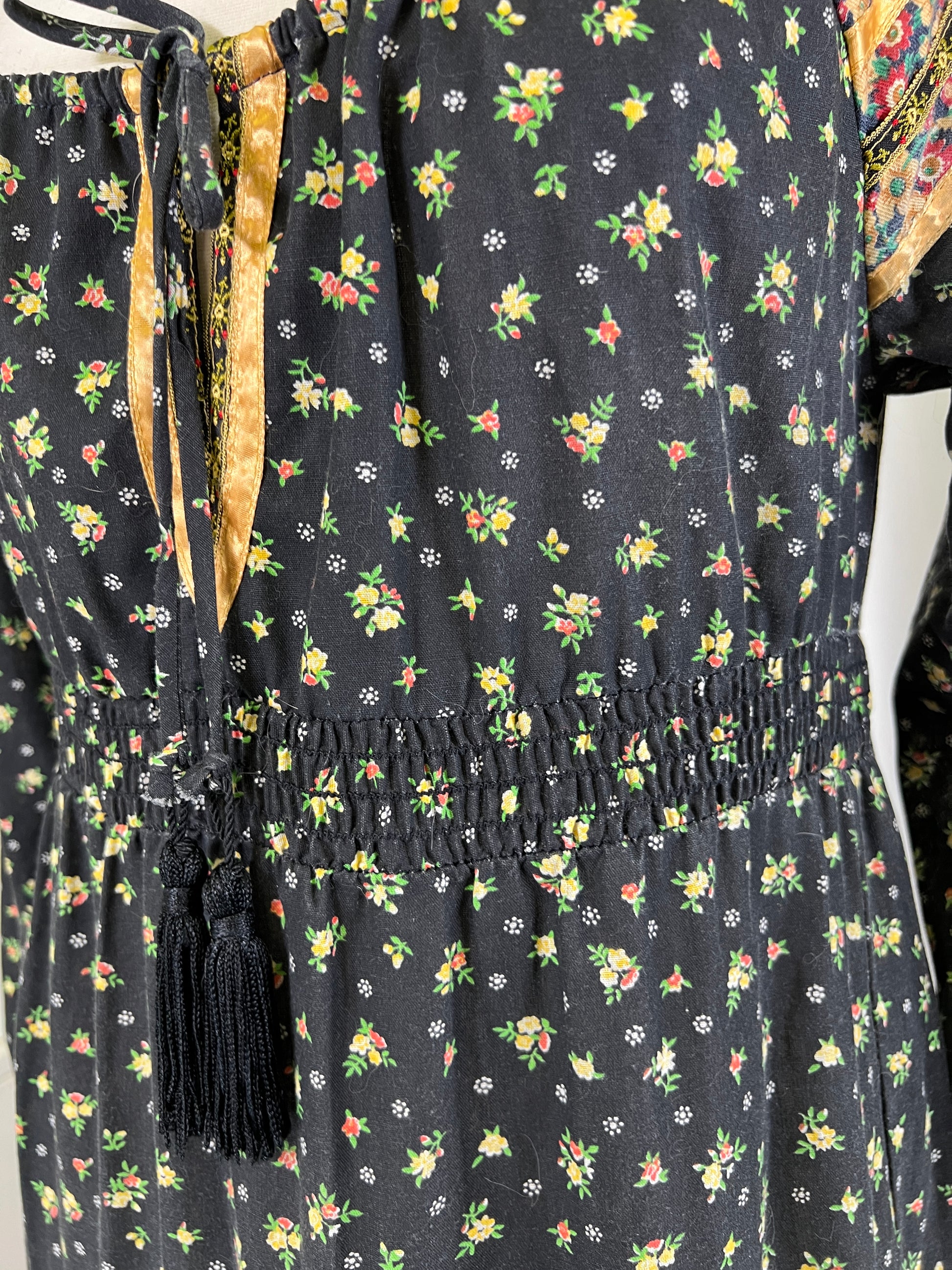 A frolic In a meadow or picnic with a lover will be extra special in this floral beauty! The mixed ditzy florals are beautiful and the peasant style is so perfectly 70s! The dress has what seems to be a string inside of the top that has lost some tightness so the shoulders are a little loose and the waist elastic isn’t as tight as it once was, but would be lovely belted!