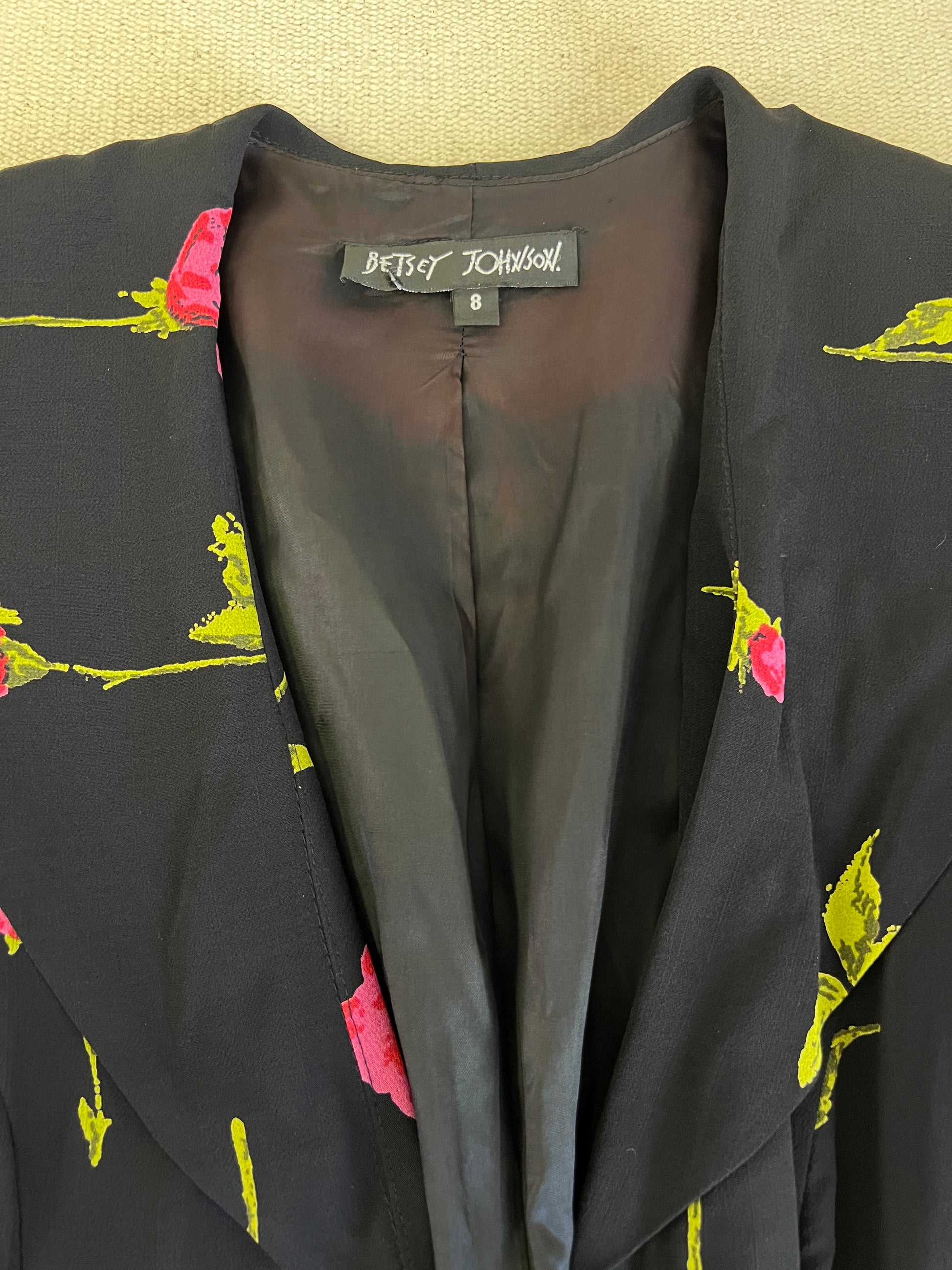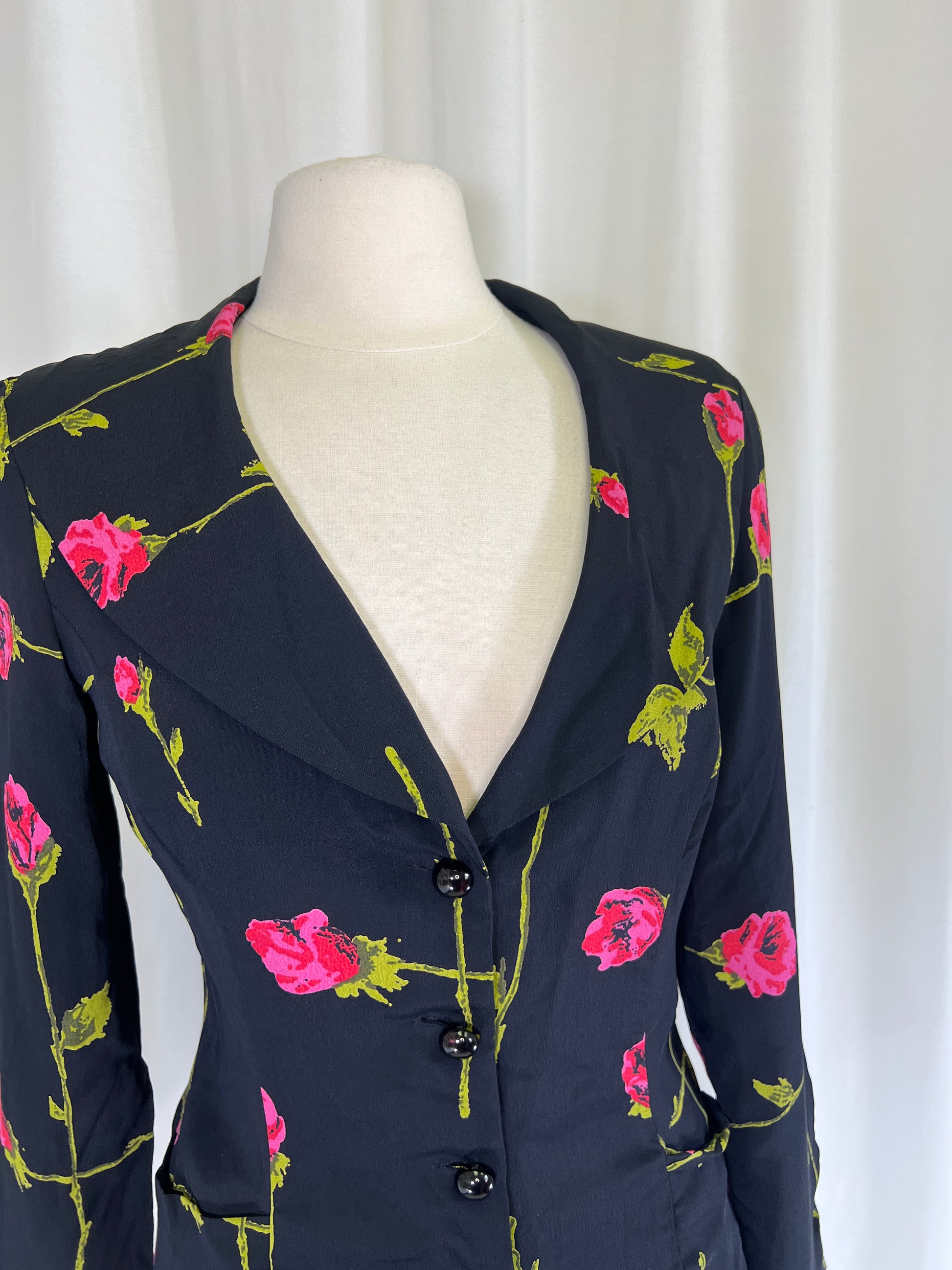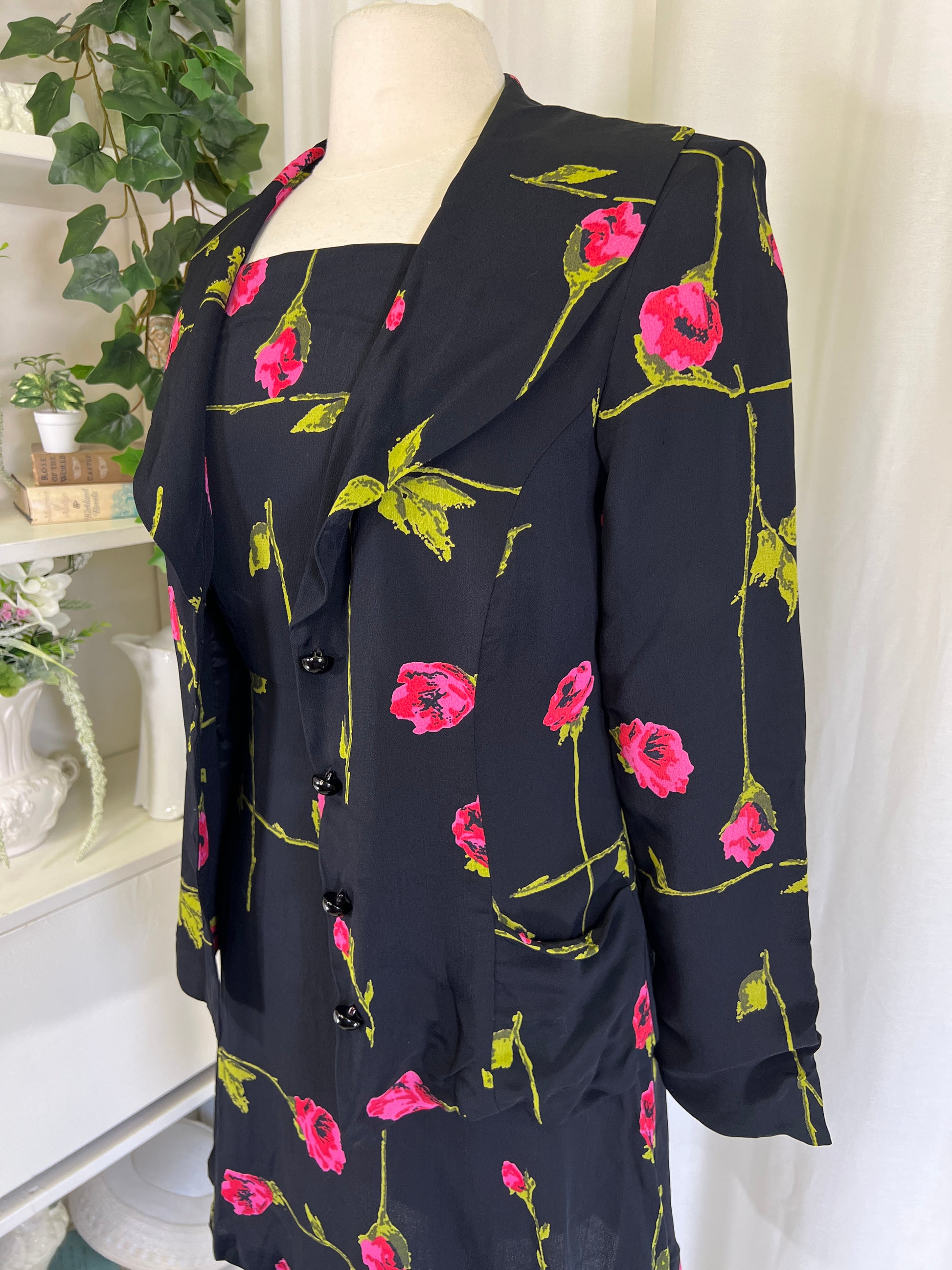 Are you ready for your rom com heroine moment? This Betsey Johnson set is covered in long stem roses and screams 90s romance! Wear them together with some kitten heels, or mix and match with your wardrobe! The dress is perfect on its own and the Jacket looks so chic with jeans and heels! The dress is marked a size 6 on the tag and the jacket a size 8.